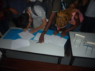 Une heure a été consacrée à la confection de "carnet 3 points" : l'idée est d'en faire faire aux élèves et de les inciter à y inscrire quelques mots en lien avec la thématique, à chaque séance de travail sur la sélection du Prix Carbet des Lycéens. Chacun est donc reparti avec un "kit de base" : 2 poinçons, 1 réglet, 2 aiguilles à coudre, des feuilles... de vraies armes pour une action effective.